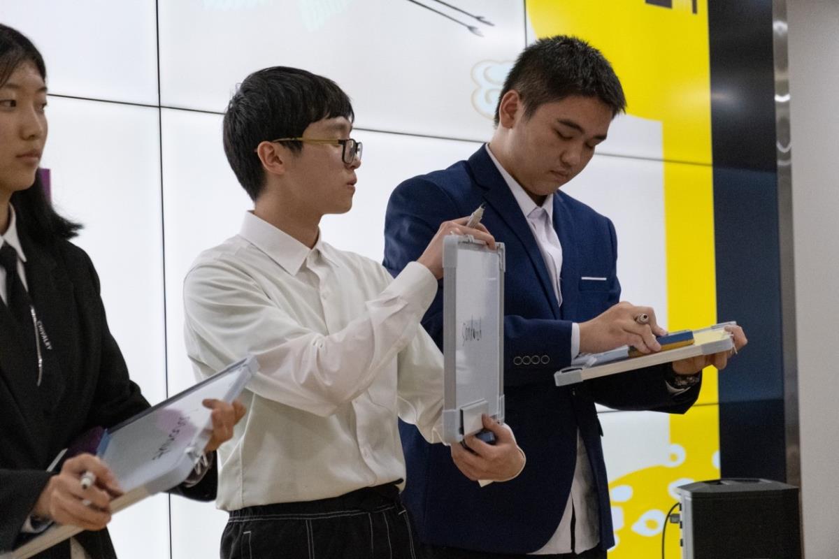 正式比赛共分为三轮,第一轮为“你划我猜”,该环节不仅要求选手们对中文成语的对应英文表达意思领悟透彻,还要考验同学们的现场情景演绎能力。参赛同学根据抽签情况两两一组,他们精彩的表现赢得了现场阵阵掌声。