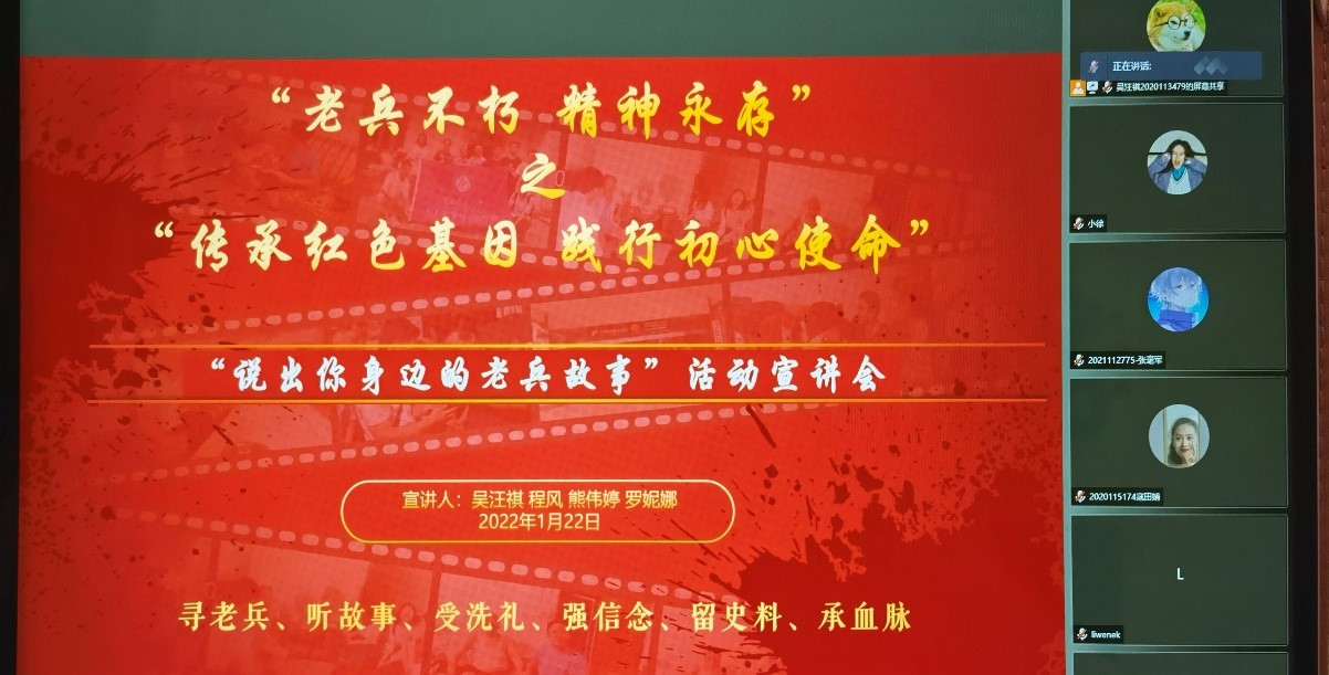 2022年1月22日,项目组为全体参赛成员开展了一次老兵寻访技巧和注意事项的线上宣传培训会。在宣传培训会上,来自项目组各个部门的核心成员为参赛选手分享了寻访老兵的一些经验,以及关于本次比赛提交作品的相关注意事项。在会议最后,同学们积极提问,项目组成员详细解答了各队伍的问题,并期待大家的优秀作品。至此,宣讲会结束。