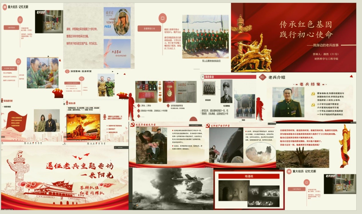 九支决赛队伍按照抽签顺序,依次向大家讲述了自己采访的老兵的传奇故事。由于疫情原因,我们虽未能在线下举行答辩会,但透过电脑屏幕中那一抹抹中国红,我们也感受到老兵精神的独特魅力。