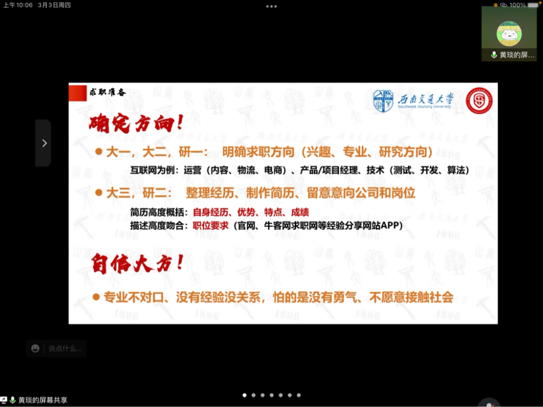 第一位参与分享的是来自交运学院的研究生黄琰,目前签了阿里集团的工作。他将自己的求职经验总结为三条:提前准备、确定方向、自信大方。在交流过程中,黄琰同学还特别强调要破除以往的求职观念,结合当下的就业环境,灵活处理,这样才能找到自己心仪的工作。