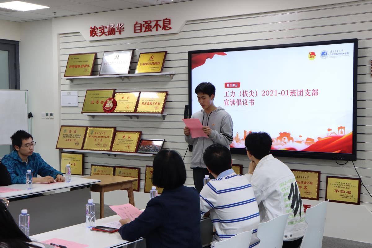 然后,工力(拔尖)2021-01班团支书徐文杰宣读了三个拔尖班团支部发起的“青春献礼二十大,强国有我新征程”倡议书。倡议书倡议力航学院青年学子们传承力航学院“严谨治学、严格要求”的“双严”传统,以拼搏的青春迎接党的二十大的召开,以优异成绩向共青团成立100周年献礼。