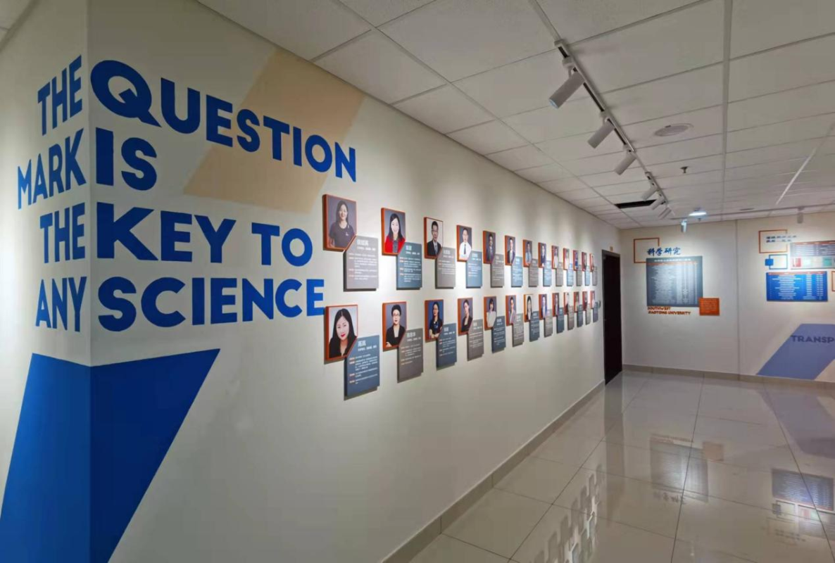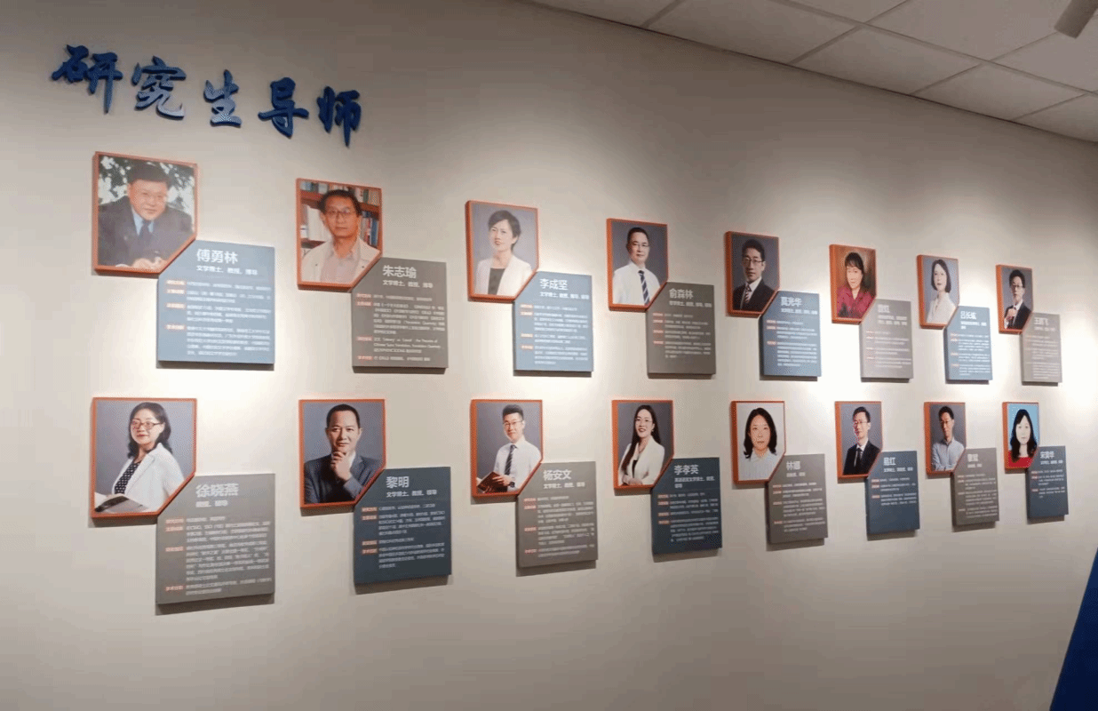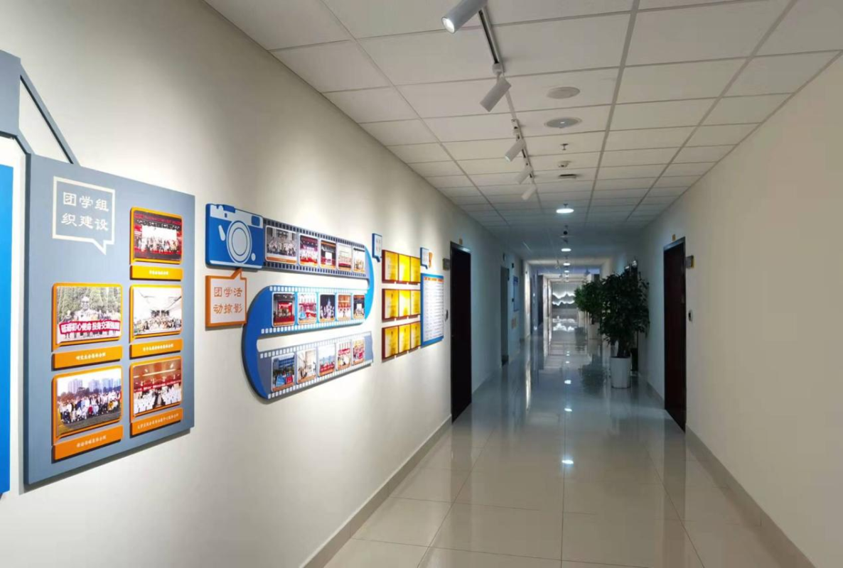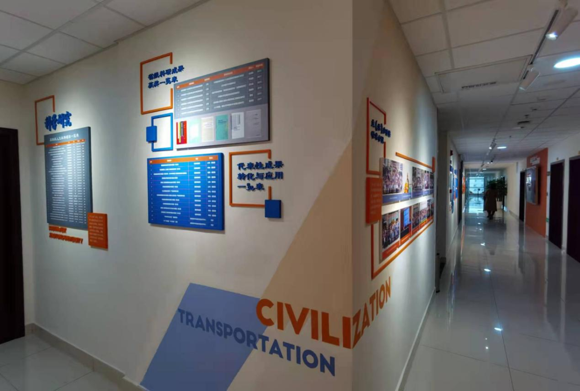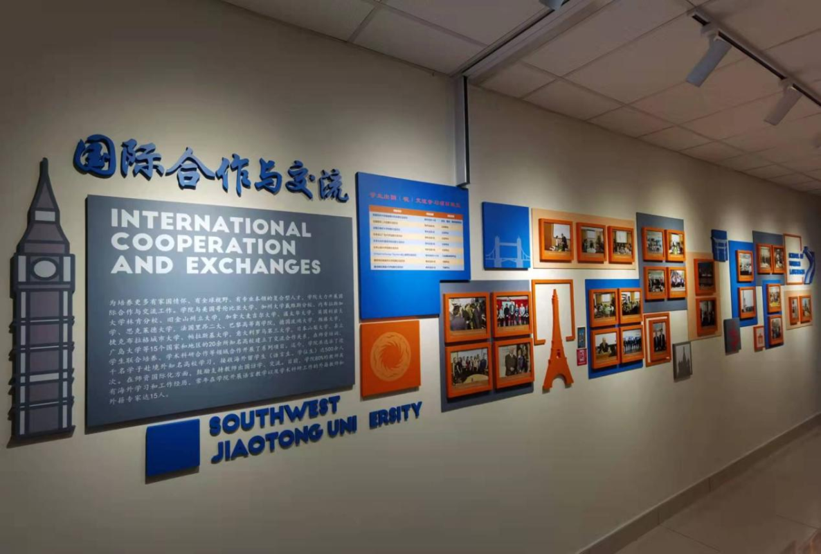 出了电梯门,色彩风格的碰撞让人眼前一亮,蓝的深邃、橙的热烈……醒目的交大蓝中亮出了外国语学院的新貌,时尚的电子屏里滚动着过去、现在与未来。语言文化在这里碰撞交融。