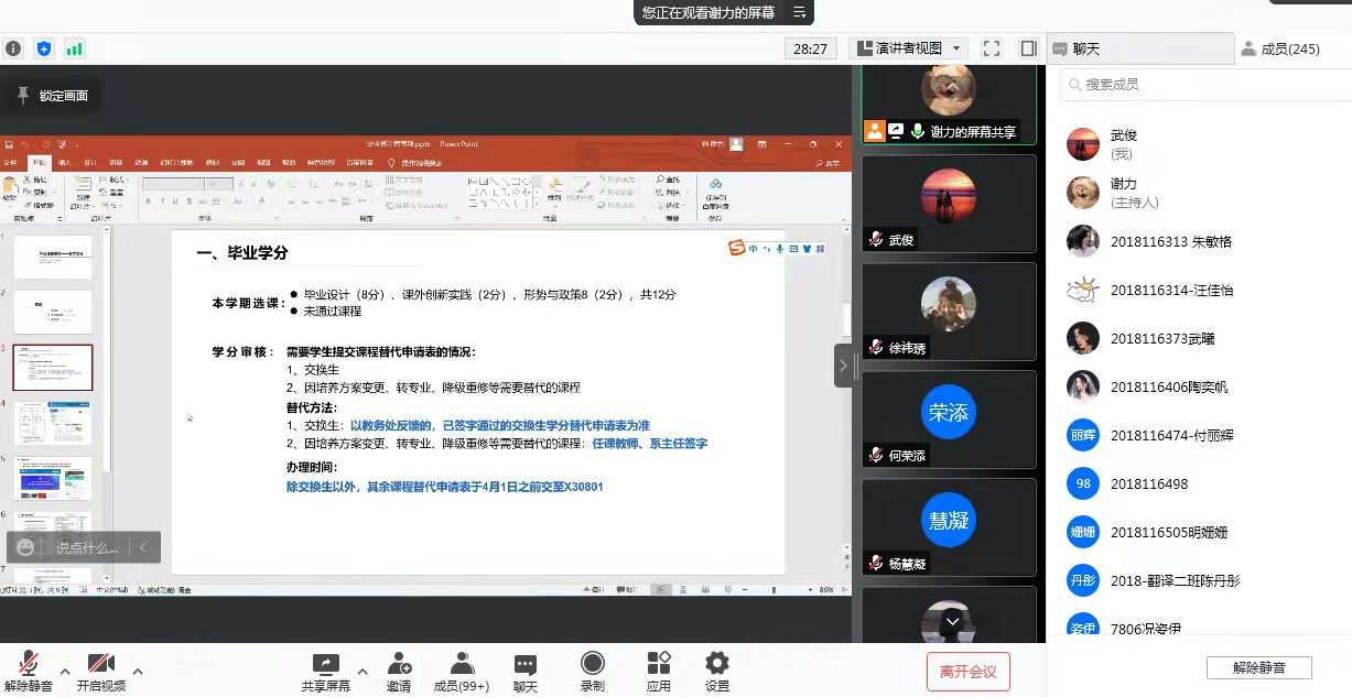 2018级年级大会于3月8日上午10点通过线上会议成功举办,2018级辅导员孙谢力老师主持会议,学院党委副书记武俊、学院教学部老师郝慧颖受邀参加会议,2018级全体本科生准时与会。会议围绕毕业要求、毕业学期重要时间节点、毕业生职业生涯规划等内容展开,详细讲解了学生关注的毕业情况,引导学生顺利毕业。