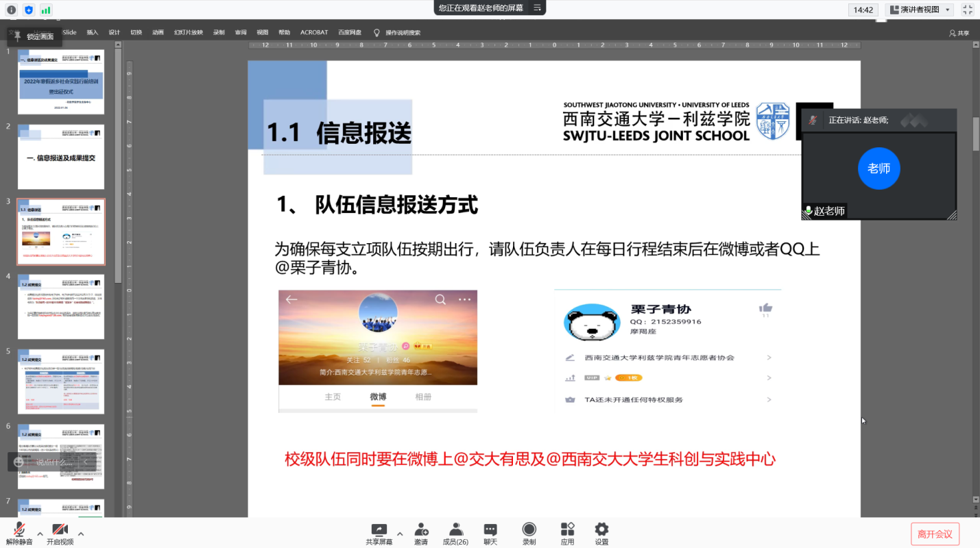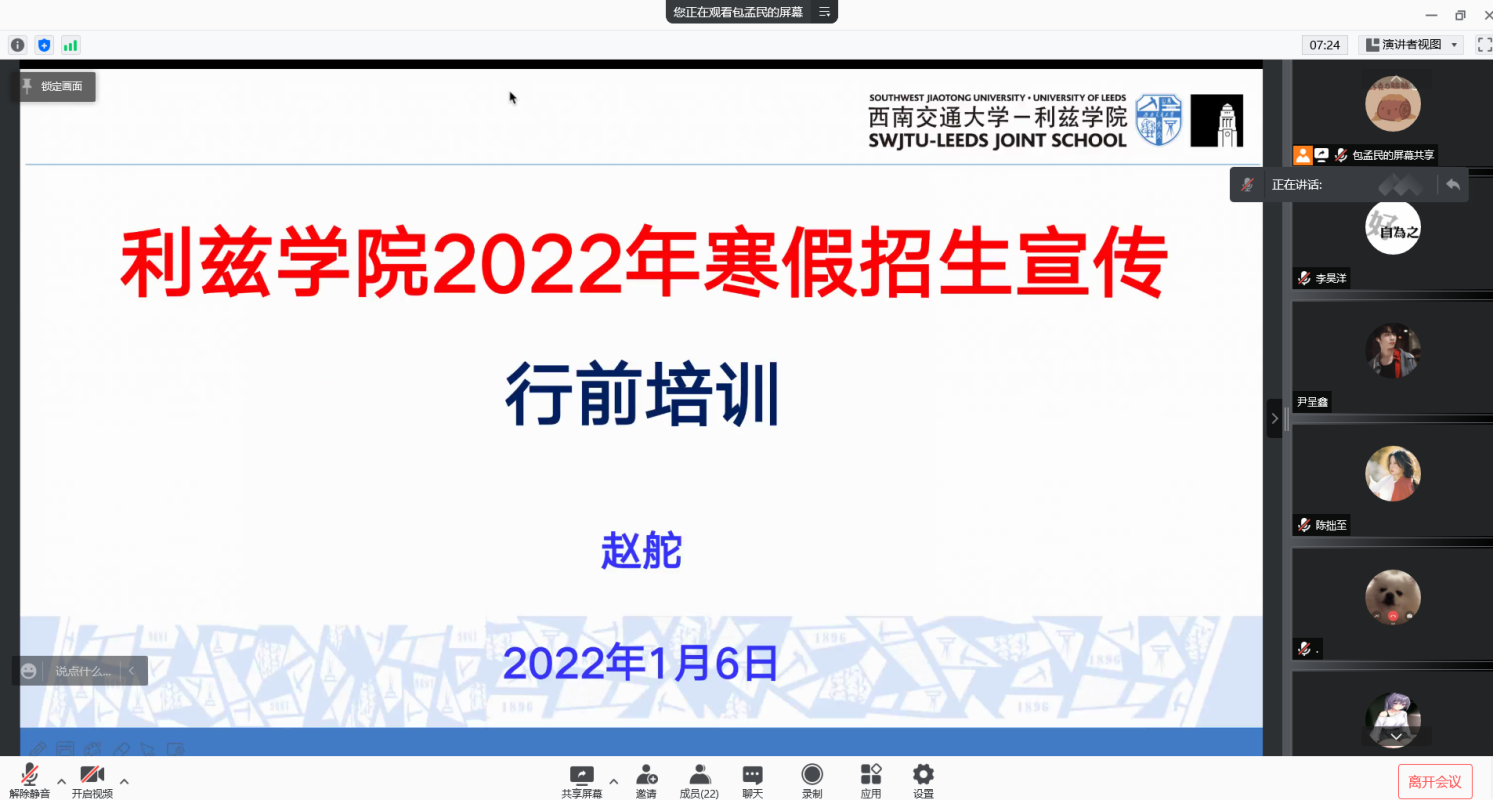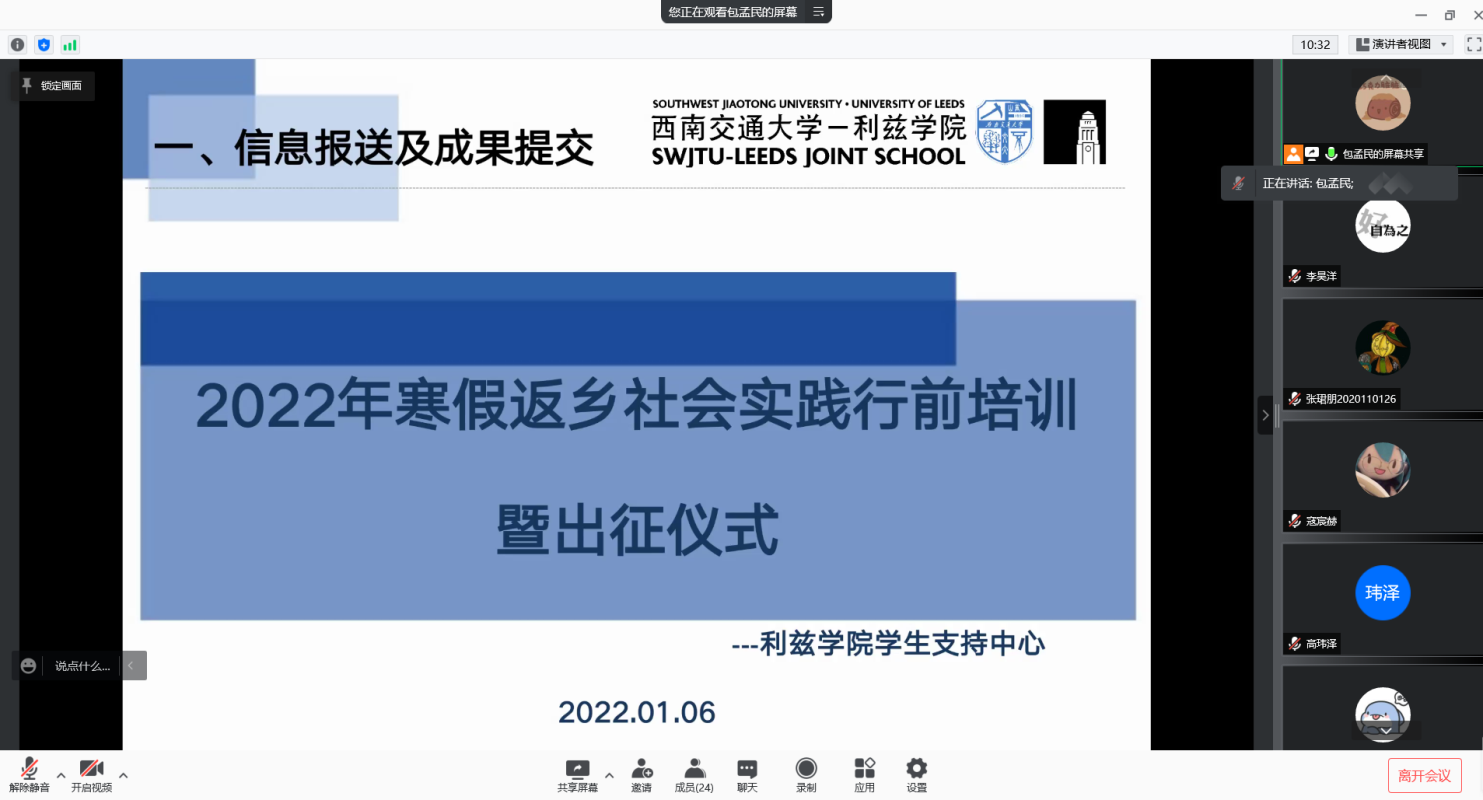 2022年1月6日晚,利兹学院通过腾讯会议举行了2022年寒假“返家乡”社会实践活动及寒假返乡招生宣传活动行前培训会暨出征仪式。利兹学院党委副书记赵舵、学生支持中心辅导员包孟民、李昊洋出席本次活动。