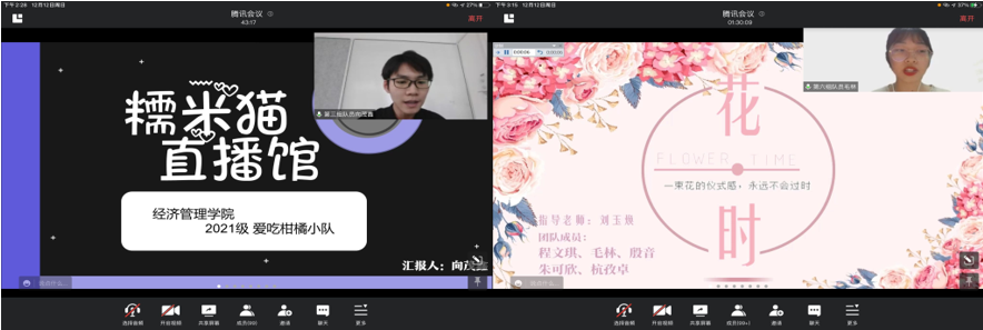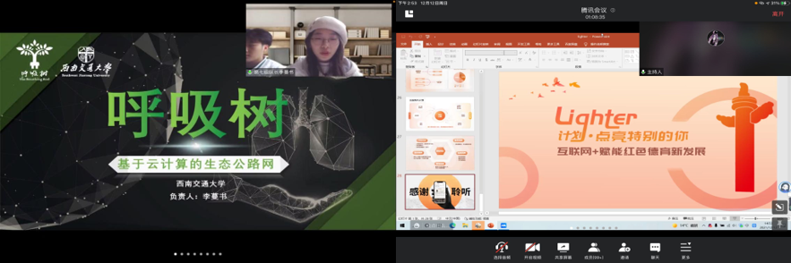 决赛为积极配合疫情防控工作,于2021年12月12日下午2点在腾讯会议线上进行,进入决赛的各队伍通过线上的项目阐述与答辩为各位老师和同学呈现团队的努力成果和项目优势。决赛环节中王一帆老师、范婷老师、敬永春老师和覃蓉芳老师受邀作为评委共同对各项目作出公平公正的评议。11支队伍准备充分,分别从市场需求、市场前景、盈利模式和项目可行性等方面进行了精彩答辩。评委老师认真聆听,给出了许多中肯的建议。最后,旨在采用以呼吸树净化装置为主、路面简易发电装置为辅的模式,来解决当前环境污染问题的项目“呼吸树——智能监测光合照明生态公路网”荣获大赛一等奖。项目“Lighter 计划——互联网+赋能红色德育新发展”和项目“糯米猫直播馆”分别荣获大赛二等奖。项目“花时”,项目“云起时——老年人群生活助手”和项目“Partner”分别荣获大赛三等奖。