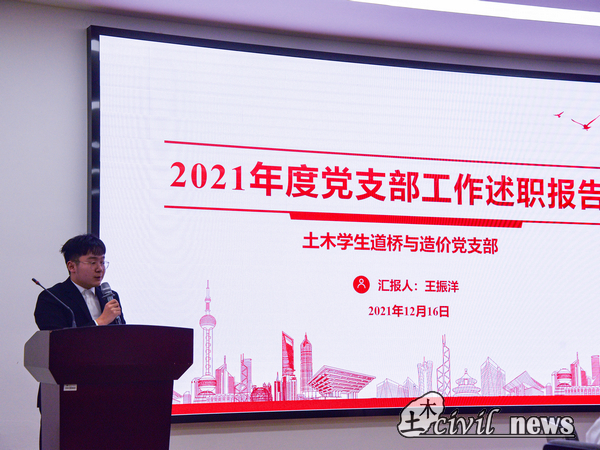 15点30分,会议正式开始。首先由土木学生城地党支部书记张紫奕作述职报告,她首先对土木学生地下党支部2021年的工作进行了总结与概括,着重对党支部内党史学习教育情况以及入党积极分子和预备党员选拔情况进行了介绍,指出党支部在本学年的工作中表现出的问题,最后,就这些问题提出了土木地下党支部未来的发展计划。第二位作述职报告的是土木学生第一党支部的支部书记杨鑫杰,他从支部党员发展情况、支部政治信仰学习情况以及支部的活动开展情况这三方面汇报了支部本年度的主要工作。