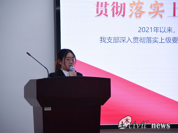 随后,土木学生第四党支部书记吴俊婷对过去一学年支部的活动开展情况以及预备党员选拔情况进行了总结,着重汇报了支部在志愿者活动以及党员责任寝室方面的工作成果。土木学生第五党支部书记刘涛、土木学生第七党支部书记刘宇轩,以及土木学生第八党支部书记马骏驰都从党支部成员的党史教育、知识学习、党内互助、党员选拔、服务群众等方面对党支部的工作进行了概括与反思。土木学生第九党支部书记庞经滔重点汇报了支部开展的一系列党史学习教育活动,在本年度,第九党支部以党史学习教育为主线,以激励党员理想信念为着眼点,以提升同志们的政治素质及党史涵养为目标,结合支部成员的兴趣爱好,开展了多次专题学习会、组织生活会活动。