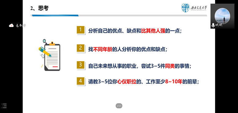为提升同学们的沟通能力、思考能力,增强心理素质,帮助同学在未来工作招聘中找准自身定位、积累宝贵应聘经验,做好职业规划,提升就业综合竞争力,物理科学与技术学院于11月4日至12月2日以线上线下结合方式开展并圆满举办“创·战计”求职训练营。本次活动主要由三个部分组成: