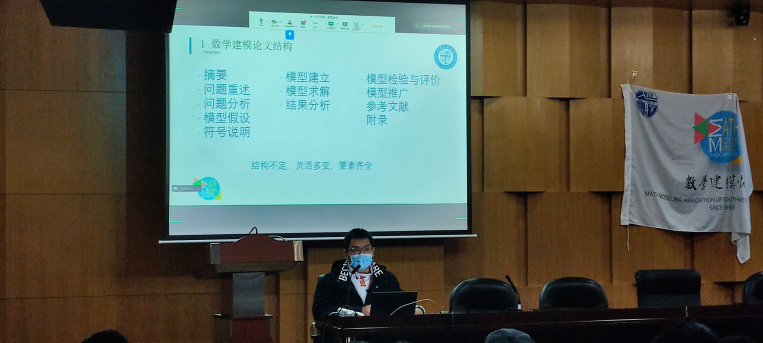 紧接着,由数学建模协会会长周聪杰,向大家阐述了写手在数学建模中的重要性。一篇整洁的论文可以在总分中占据10分的比重。并且建议大家抓住论文集中的一些编写细节,提高论文的整洁度以及可读性。