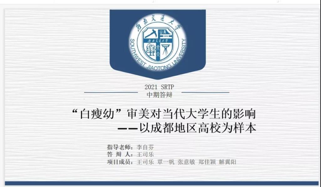 由李自芬副教授指导的“‘白瘦幼’审美对当代大学生的影响--以成都地区高校为样本”项目组展示了问卷设计、抽样调查、问卷分析的阶段性成果;接着他们介绍了该项目的创新点以及对大学生审美观和心理健康的意义;最后他们展示了项目组成员在研究过程中的收获与反思。展示后, 李栋老师建议项目组在后续的研究中结合性别理论,深化主题,凸显课题的时代性;段莉萍老师也提出建议,表示项目组可以探究不同文化背景,比较传统审美与现代审美。