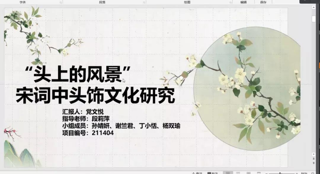 随后,段莉萍副教授指导的“‘头上的风景’宋词中头饰文化研究”项目组进行答辩。答辩人表示该项目组专注于“宋词”与“头饰”之间的强联系,细化研究内容;并且对于学术界鲜有研究的男性头饰该项目组也会着力研究。接着,答辩人对项目的研究进行反思,如项目名称不准确、头饰归纳含糊不清、组员合作交流少等问题。展示后,李栋老师提出问题,询问关于男性头饰文化的进度,答辩人表示会在后期进行充分研究。