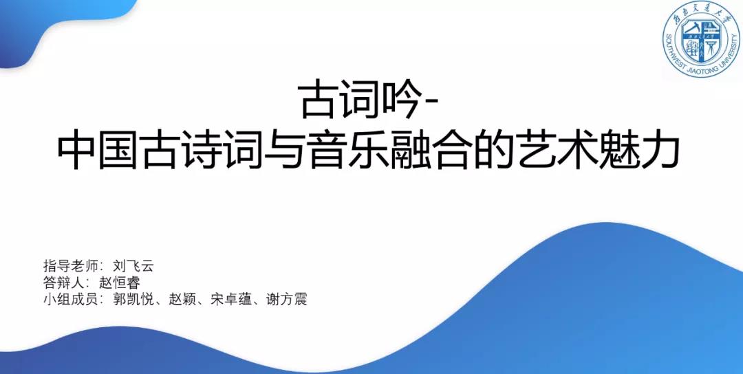 参与此次答辩的小组研究项目是:“古词吟——中国古诗词与音乐融合的艺术魅力”,该组成员从项目特色、项目创新点、项目进展和收获体会四个方面进行讲述,指出他们的研究是希望将古诗词与音乐结合,努力找到诗词与音乐之间的平衡。在收集数据方面,该组同学通过问卷调查的形式,获得了一手资料,这也是此次研究的创新点所在。谈及收获和体会的时候,该组同学表示,通过这一项目不仅拓展了自己的知识面,锻炼了自己的思想与行为,还增强了团队合作意识。