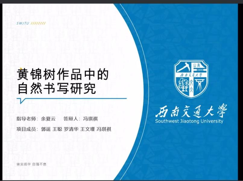 第二组是余夏云教授指导的“黄锦树作品中的自然书写研究”项目组。答辩人首先向我们展示项目特色与创新点,包括研究对象新颖、研究对象意涵丰富;接着向我们展示了项目进度与成果,其中,答辩人对意象与描写方法进行详细说明,展示了项目组成员对于作品中意象的独特看法。答辩结束后,李栋老师对作品中的意象进行追问并询问项目组针对辩题的研究是否有超过前人的地方,答辩人回答了其研究意象内涵并表示项目组从自然书写的角度切入是新颖的。