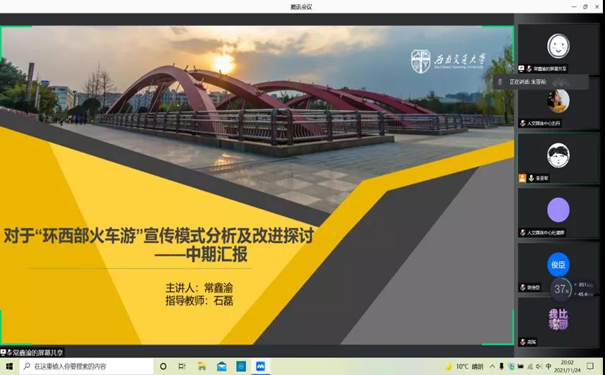 首先,第一组同学以“环西部火车游”宣传模式分析及改进探讨为选题进行答辩。第一组同学将答辩分为目前进展、挑战与困难、下一阶段计划三个部分。该组同学表示目前青藏线列车车内改装计划正在进行中,同时受疫情的影响,他们计划采取线上发放调查问卷的形式进行信息采集,并以此为依据撰写综述。