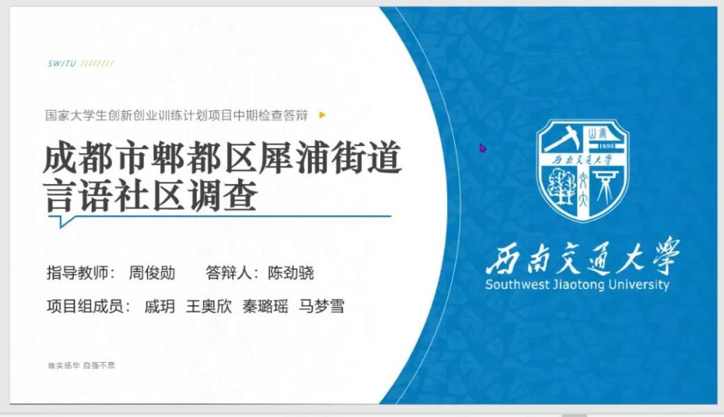 第一项目组以“成都市郫都区犀浦街道言语社区调查”主题进行研究。答辩人从项目特色与创新、项目实施与进展、项目收获与体会三方面向大家展示。在学科研究特色方面,答辩人表示言语社区是社会语言学的一个核心概念,是社会语言学理论和方法中许多基本问题的交汇处。在调研区位特色方面,犀浦街道处于天府腹心之地,外来人口多,城市化进程快,城市化所引起的语言变异情况越来越凸显。在成员背景特色方面,项目组成员方言背景丰富、专业本领过硬、科研经历丰富。在项目实施与进展方面,答辩人表示他们主要采用文献学习与研究、线下考察与调研、数据整理与分析来进行研究。在项目收获与体会方面,答辩人从理论与实践两方面来阐述自己的收获。在展示过后,指导教师周俊勋教授提出改进意见,表示希望项目组成员能针对外来人口对四川方言的理解程度、交流程度以及不同语言之间相互冲突、矛盾的地方在后期进行深入研究。