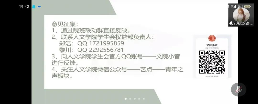 在会议的最后,郑洁同学为同学们提供了一些意见反馈渠道,鼓励同学们积极反馈意见,提出建议。19时42分,本次会议圆满结束。