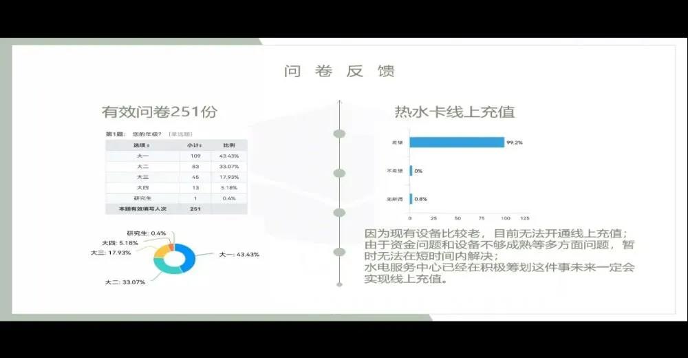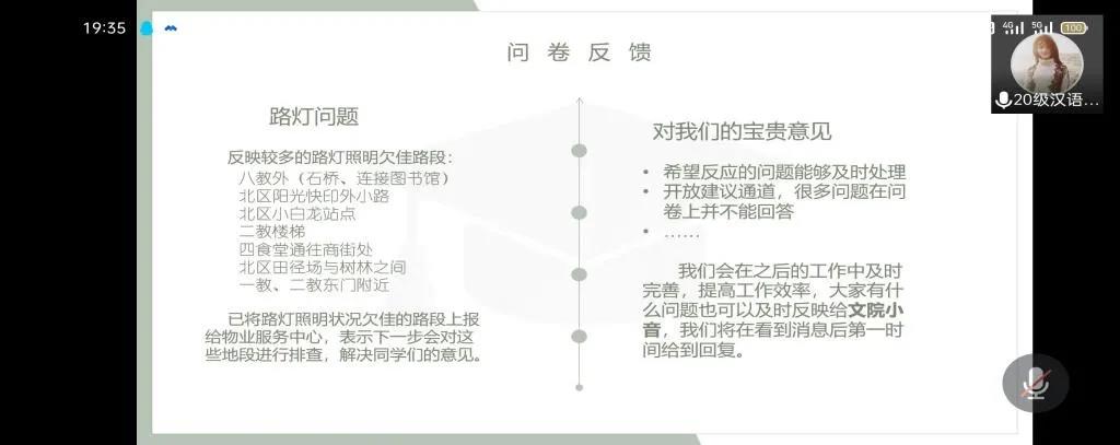 在此次会议中,郑洁同学首先就之前的问卷调查情况做出反馈,对同学们之前提出的关于热水卡线上充值、电瓶车充电桩、食堂、路灯等问题意见做出了回复。