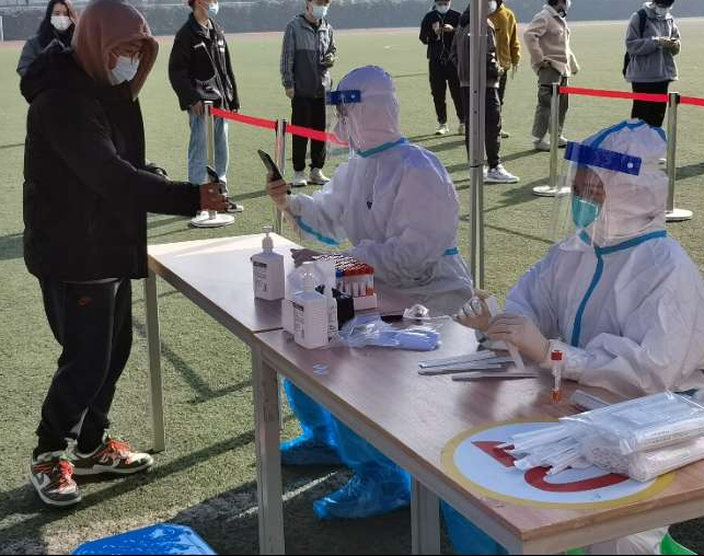 迅速到达现场后,校团委郑源老师和疾控部门负责人为志愿者们进行了快速培训,志愿者们在孔祥彬老师、周子涵老师的组织下快速进行了分工,5名志愿者换上全身防护服,在检测点位协助医务工作者进行核酸检测工作,一部分同学负责引导同学们完成核酸检测准备工作并进行登记,一部分志愿者引导完成检测的同学们迅速有序离开场地,维持场地的秩序。