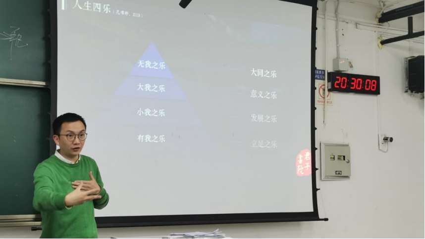 最后讲座的第四部分,孔老师谈了自己的三个体会:一是“人须在事上磨”,每一次活动的组织都是对自己可迁移技能的磨炼和提高;二要做一个靠谱的人,智商、情商、逆商缺一不可;三是人与人的差别主要在格局与气度,担任班委会遇到许多误解,困难重重,孔书记勉励现场同学们不要怕吃亏、不要斤斤计较,要心胸开阔,多付出、多做事,相信花有开的那天。最后,孔老师鼓励大家在实干中去感悟小我和大我的不同,不断提升自己的境界。