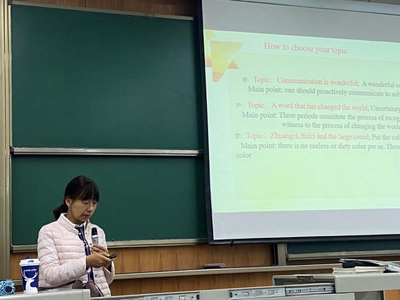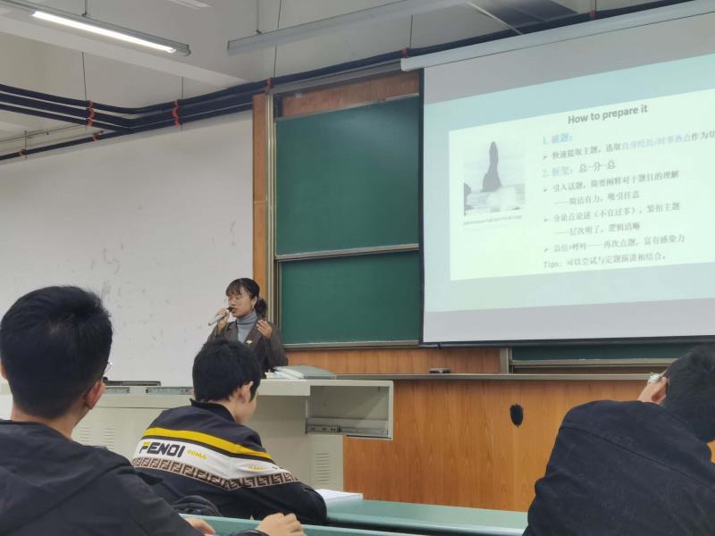 王惠老师首先向同学们讲解演讲稿的写作方法。她表示演讲稿的话题应从小到大,从细小的话题展开,拉进与观众距离,引发观众感触。同时,王老师也展示以往参赛者例句,引导大家写出好句子引起评委共鸣,引出话题,并且播放了往届参赛者参赛音频,阐明各种正文结构及其文本优缺点,以太极为例让在场学生列出提纲切身领悟演讲稿写作的注意事项。