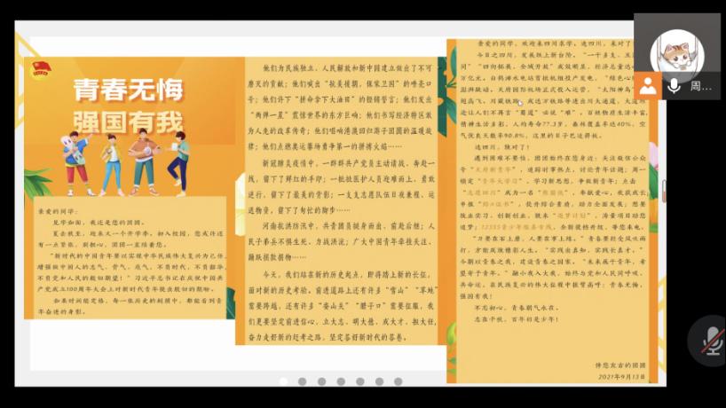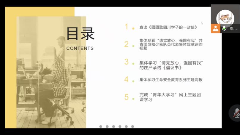 本次团课主题为“请党放心,强国有我”,主持人周仲仪首先带领参与活动的全体团员共同宣读了《团团致四川学习的一封信》,所有同学都备受鼓舞振奋精神。在积极良好的学习气氛下同学们共同观看了“请党放心,强国有我”共青团员和少先队员代表集体致献词的视频,并集体学习了“请党放心,强国有我”的庄严承诺书以及生命安全教育系列主题海报。