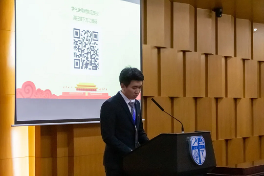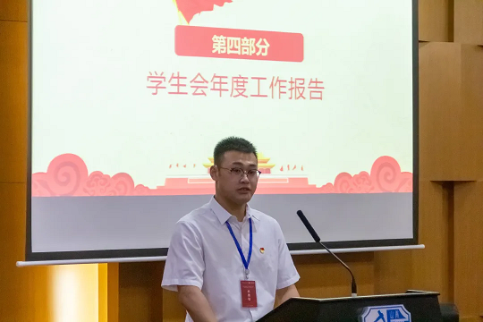 由李冠宇主席代表学生会进行学生会年度工作报告。他向大家介绍了学生会这一学年的工作内容与工作成果。
