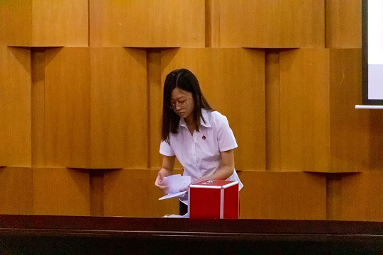 最后,总监票人胡峥与监票人于佳弘、侯辰典检查投票箱之后,与会代表依次上台投出自己宝贵的选票。