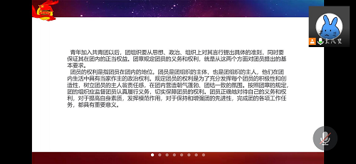 最后,由班长总结了本次的主题团日活动,并呼吁同学们在日常生活中能牢记自己的团员身份,积极向党组织靠拢、学习党的知识。本次团日活动顺利结束。