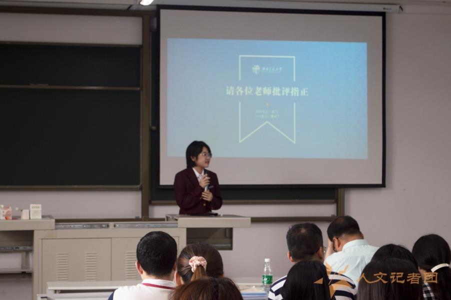 出席中文系答辩的老师分别是唐新梅、刘玉珺、李自芬、李栋、赵静、黄阳、吴德利和余夏云;出席传播系答辩的老师分别是杨琴、朱亚希、蒋宁平和李钢;出席音乐系答辩的老师分别是刘蕊、汪漾、吴毅、王彦力和张娟霞。各个教室首先进行的是前一年各组SRTP项目的结题答辩,各组同学纷纷上台,依次展示了小组成员在指导老师的帮助下,在这一年时间中的研究结果。展示结束后,对应专业的老师也针对项目中的内容对同学们进行提问,大家也相应做出自己的解释与说明。