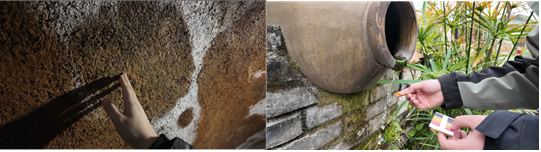 团队采集了酒庄周边岩土样本,测定了水质pH值,分析其对酿酒的影响。调研发现,邛崃地区独特的侏罗系砂岩地质构造在酿酒过程中扮演了至关重要的角色。这种砂岩孔隙率高,如同天然的过滤器,能够有效地过滤和净化地下水。经过这种地质层过滤后的地下水,不仅清澈透明,还富含多种对人体有益的微量元素,如钾、钠、钙、镁等,这些微量元素在酿酒过程中与酒液相互作用,赋予了邛崃酒“甘冽柔润”的独特品质。制酒师傅简伯伯形象比喻:“岩土是酒的胎盘,水质是酒的灵魂。”