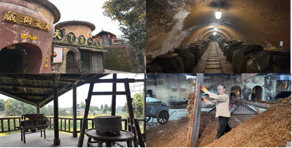 实践团队深入邛崃大梁酒庄,先后参观了酒庄内历史悠久的地下酒窖、古朴的水石碾作坊以及蒸汽氤氲的传统烧坊等核心酿酒场所,记录了工人师傅全手工制酒的过程。基地工作人员赵女士全程陪同并详细讲解了邛崃酿酒的完整流程,从高粱筛选到蒸煮发酵,从酒液蒸馏到坛装窖藏,每一道工序都凝聚着匠人精神与岁月沉淀。