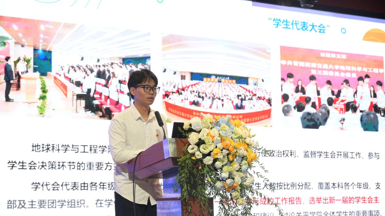 紧接着,学生会主席团成员张熙,总体介绍了学生会与九大团学组织的基本职能与学生会架构,强调在学生工作中要传承地学文化精神,贯彻落实全心全意为同学服务的宗旨,在助力学院发展中团结奋斗、挺膺担当。