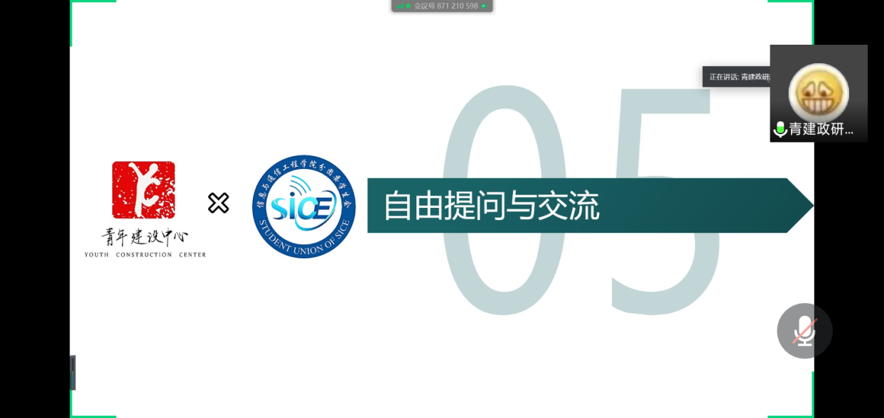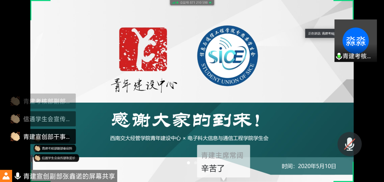 为了加强与电子科技大学的交流,同科大信通学院学生会建立友好关系,同时探索疫情影响下学生组织新的运行模式,学习借鉴双方学生组织工作经验,英国上市公司365经济管理学院青年建设中心与电子科技大学信息与通信工程学院分团委学生会于5月10日下午顺利开展“信通云端,志联青年”线上交流会。