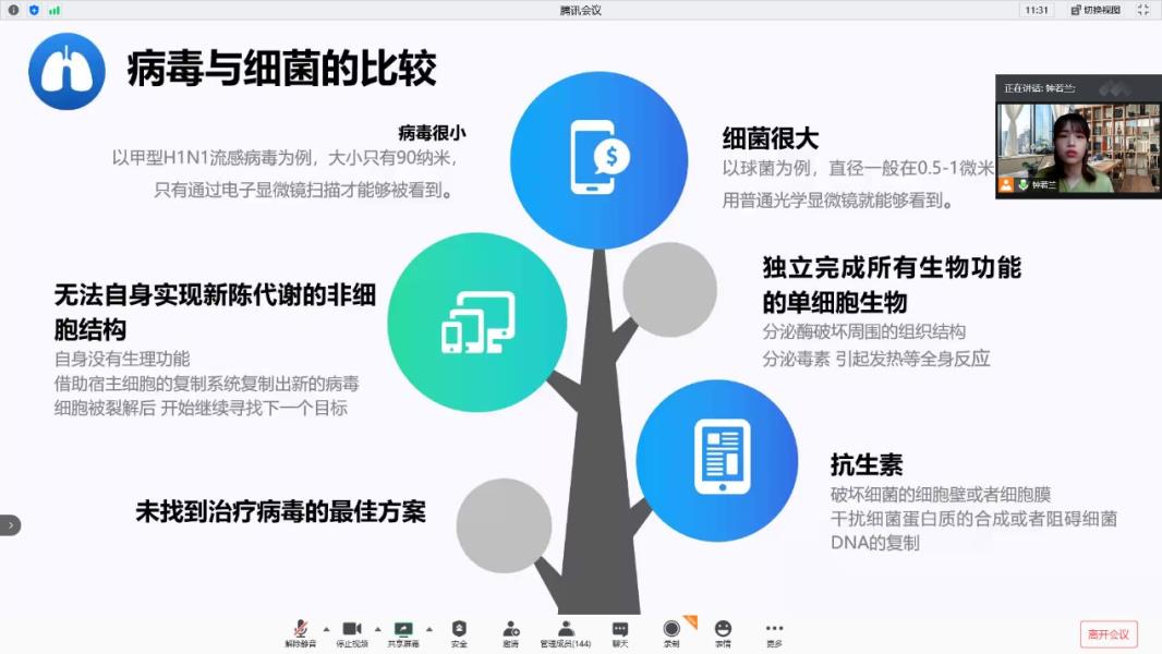 7月30日,上午九点至十点。病毒知识科普课程在腾讯会议平台上进行分为两组课堂授课。