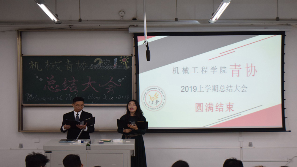 7点30分,总结大会准时开始。主持人蒋凯宁与李雨璠回顾这半学期以来的志愿活动。然后播放了机械青协近半年来举办的活动的视频剪辑,这让青协成员回望了这半年来他们取得的种种成果。