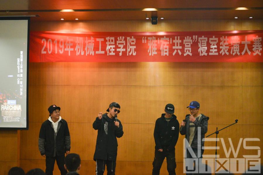 当活动正式开始,首先,由机械园区指导老师何蕊芯老师发言,她期盼机械学院同学能够拥有一个更好宿舍环境,并希望机械学子可以传承学校开拓进取的精神,展示交大机械人的风采。何老师精彩的发言,赢得了在场观众的热烈掌声。紧接着到各个宿舍的展示环节。第一位出场的寝室是T035071动物世界,他们从宿舍名字的来源,到宿舍的艺术文化氛围等进行了详细的介绍,并展示了一段相声。第二位出场的是T042064石屿,他们的答辩与表演同样十分精彩,他们用一首《等你下课》表示了青春期的悸动与美好,引得现场观众的共鸣。第三位宿舍T035100壹佰,他们的宿舍名表示了每位成员都要在考试中获得满分的志向。他们用歌舞情景剧的方式展现了宿舍之间似家人似兄弟的关系。