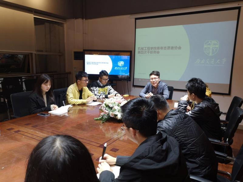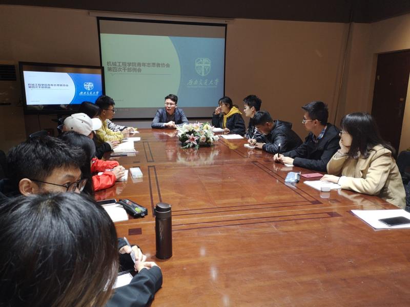 11月6日晚上9点15分,机械工程学院青年志愿者协会在X2201召开了第四次干部例会。参与此次例会的有机械青协指导老师黄兆国、机械青协四位会长:元越、朱树鹏、袁增威、田威,以及各个部门的部长。