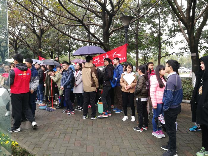 9点45分,来自18个学院的志愿者们纷纷冒雨来到竢实扬华碑前集合。10点钟,活动正式开始。主持人向志愿者们传达了以“为人民服务”为核心的伟大时代精神,要向雷锋同志学习。之后,在志愿者代表刘梦竹同学的引导下,志愿者们面向竢实扬华碑进行了庄严的宣誓。宣誓完毕,主持人宣读了各学院清洗雕塑的名单,并着重强调了安全问题。最后,工作人员为志愿者们发放了马甲、帽子和袖标,为本次活动增添了一份色彩。