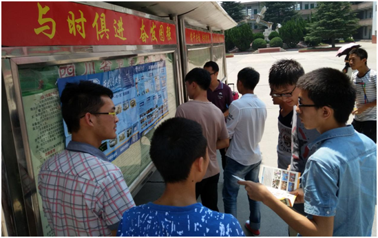 第五天,志愿者们来到了冕宁县冕宁中学,首先和学校相关负责人和安保人员进行了简单沟通,并获准在校内进行宣传,志愿者们随后将交大宣传海报张贴于宣传栏上。志愿者们递给他们交大宣传手册,对交大进行了简单的介绍。交大的优势学科有土木、机械、电气、交运、信息、测绘等,志愿者们提到交大土木在今年还增加了两个专业。此外,还对交大的杰出校友、交大的双严传统等进行了简单介绍。