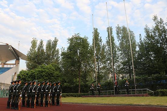 八点整,由国旗班成员组成的国旗护卫队迈着矫健的步伐,喊着嘹亮的口号,簇拥着国旗走向升旗台。随着《义勇军进行曲》的奏响,升旗手将国旗高高抛起,鲜艳的国旗在晴朗的天空映衬下显得分外鲜艳。全体师生唱起国歌,肃立敬礼,气氛庄严肃穆。升旗仪式结束后,“竢实扬华,自强不息”的精神与五星红旗一起高高飘扬于交大上空,为之后的新生分列式加油助威。