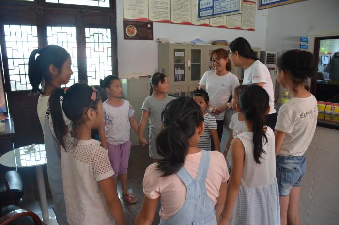 想与孩子们交流,首先就是要融入到他们之中。见面的第一天, 东乐村委会给了我们很大的帮助,不仅组织了本地的孩子,还召集了附近村子缺少假期学习的留守儿童。我们首先用各种团队配合游戏增强与他们之间的互动,原本寡言的孩子们一旦玩起游戏就打开了话匣子,把对我们的好奇都表现了出来。迈出这第一步之后,每天我们都会用一两个小时和他们折纸、画画、故事接龙、捏橡皮泥,一方面锻炼他们的动手与思考能力,另一方面让他们更习惯于与人交流配合。