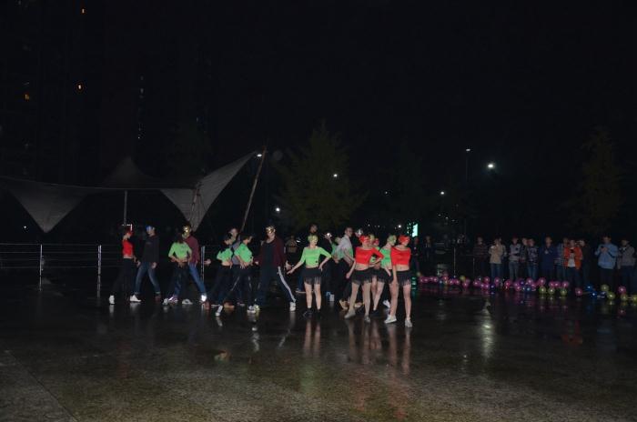 19点10分,轮滑场氛围已浓,社团人员工作人员早早地就到了现场进行场地的布置。 在寒风中,体舞协会的人们穿得单薄,却不减对此次舞蹈活动的热情。场地布置完毕后,她们也会换上自己准备的服装,参加这次假面舞会。19点30分,动感的开场舞曲响起,将现场气氛带动起来。随后,进入了第一个教舞环节,在节奏明快的音乐和体舞社团舞蹈高手的指下,同学们都认真观看并积极参与其中。社员和“老师们”的耐心与热情,使得同学们都跃跃欲试。在迷人的夜色中,同学们都开始了放松的交流和互动,现场气氛达到了一个小高潮。活动过程中,男女同学配合默契,进行了很好的互动,引来了同学们的阵阵欢呼。熟悉的音乐渐渐响起,一段浪漫唯美的双人舞表演再次将舞会推向高潮。紧接着的是一段爵士舞,她们舞出了对青春的热爱,舞出了活力。