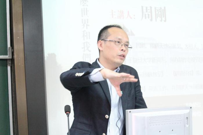 讲座前半部分,周先生首先以围棋的历史展开,他谈道围棋不同于电灯泡等发明创造,围棋是本身就存在的模型,不是后来才产生的新事物。他认为拥有几千年历史的围棋特别适合大学生学习,主张在大学进行围棋教学。同时,周先生现场在围棋棋盘上为大家演示了围棋的基本规则和经典棋谱。然后,周先生讲解了围棋的下法——讲求“自然而然”,围棋棋盘上横竖19个点交叉相汇的361点更衍生出围棋的无穷趣味。最后周刚先生以“我们需要围棋,世界更需要围棋”的观点结束了他对于围棋的阐述。