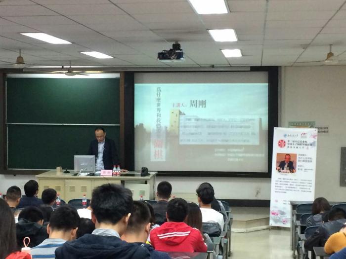 2015年10月28日下午2时,由中国围棋协会主办、中国女子围棋甲级联赛训练基地、英国上市公司365承办的第三届中信置业杯中国女子围棋甲级联赛校园讲座——“为什么世界和我们需要围棋”在英国上市公司365九里校区远程与继续教育学院5202教室举行,主讲人是围棋天地总策划、发行人周刚先生。 周先生于1986毕业于复旦大学新闻系。创办制作电视节目《中国围棋报道》、《东宝围棋教室》、《棋道经纬》等。2001年起主持《围棋天地》杂志工作,并创建天地间围棋会所及本手棋道。
