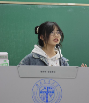 紧接着分享的是保研至武汉大学的地理信息科学石嘉馨。她向同学们分享了自己亲身参与的数学建模竞赛,这项竞赛需要根据每人的优势组建分工明确的团队,周期短、强度高,适合“以赛促学”,在实践中学习。