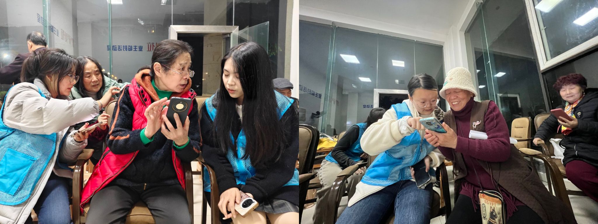 作为活动的核心执行单位,化院青协在聚焦技能教学的同时,尤为注重服务细节的优化。针对部分老年人视力不佳、行动不便的特点,志愿者们提前精心设计并打印了清晰的操作步骤示意图;活动现场,主动为老人调试手机屏幕亮度与字体大小,搀扶行动不便的老人就座并提供“一对一”专属指导。面对老人们提出的各类疑问,始终保持耐心细致的态度逐一解答。活动间隙,积极引导老人们展示学习成果、交流操作经验,使技能培训课堂同时成为促进邻里互动的温暖平台。