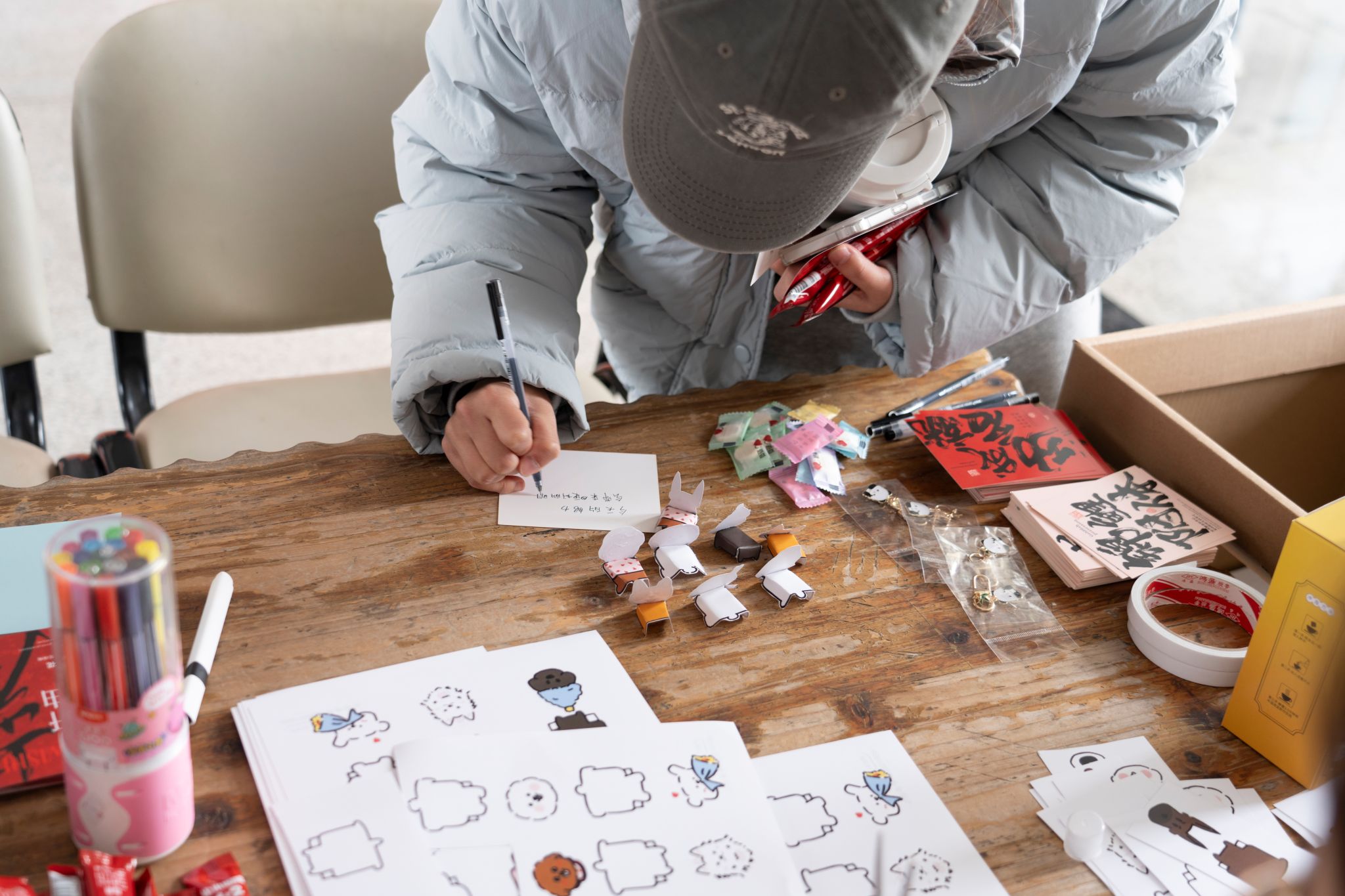 另一侧的撕纸作画解压区,成为考研学子释放备考压力的治愈空间。在志愿者引导下,学子们先写下备考中的烦恼,用水彩笔肆意涂抹覆盖,再将纸张撕碎,让积攒的压力随纸屑消散;随后把碎片拼贴在展板上,共同完成两幅集体创作,寓意加强信心的治愈历程。现场还设置“软萌纸小狗”手工环节,学子们可将考研心愿写在纸小狗上,当作随身陪伴的暖心信物,承载逐梦期许。