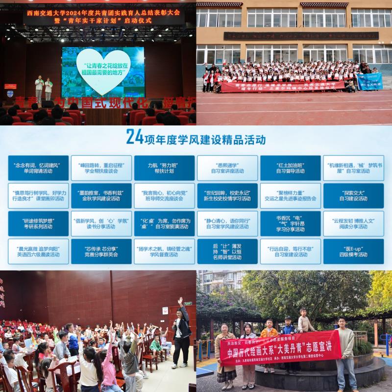 打造品牌活动,用“思政+”赋能志愿服务。充分发挥共青团组织优势和开展青年思想引领工作优势,不断深化志愿服务的政治属性和育人功能。校团委组织优秀社会实践项目和志愿者代表在2024年度共青团实践育人总结表彰大会上做经验交流分享,号召全校青年见贤思齐,矢志奉献,勤为志愿。学生会组织持续开展“我为同学做实事”项目,创新服务载体和工作方式,解决学生“急难愁盼”问题。学校第26届研究生支教团发起一年一度的“暖冬行动”,为阿坝县、秦安县地区的300余名贫困学生捐赠御冬物资,为孩子们成长温暖护航。乡村振兴教育促进会赴雷波县曲依乡中心校和菁口乡中心校开展志愿服务活动,并在学校周边社区开办周末课堂。大学生第二课堂运营中心入选2024年“中国历代绘画大系”全国大学生志愿宣讲团,深入乡村社区开展主题宣讲和社区环境改造志愿服务。通过将思政育人和实践育人相结合的方式引领青年将爱国励志的家国情怀与求真力行的躬身实践深度融合,在躬身实践中洞察社会、了解国家、读懂时代。