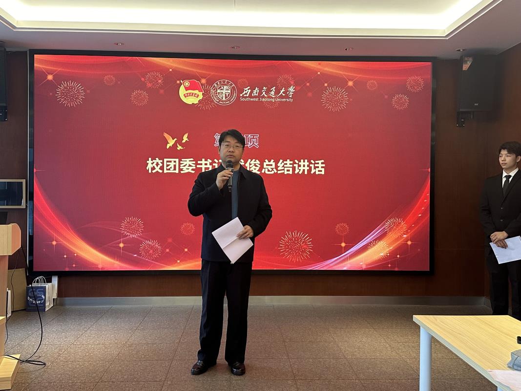 颁奖仪式上,校团委书记武俊总结讲话。他高度评价了地球科学与环境工程学院团委在实践育人及学生科创工作和学生社团管理服务工作方面取得的优异成绩;充分肯定了各学院发挥专业优势,联合举办大赛的创新工作模式;鼓励主办单位将获奖作品实体化落地,用青年喜闻乐见的文创作品形式涵养家国情怀,引领青年投身交通强国建设,让青春在全面建设社会主义现代化国家的火热实践中绽放绚丽之花。