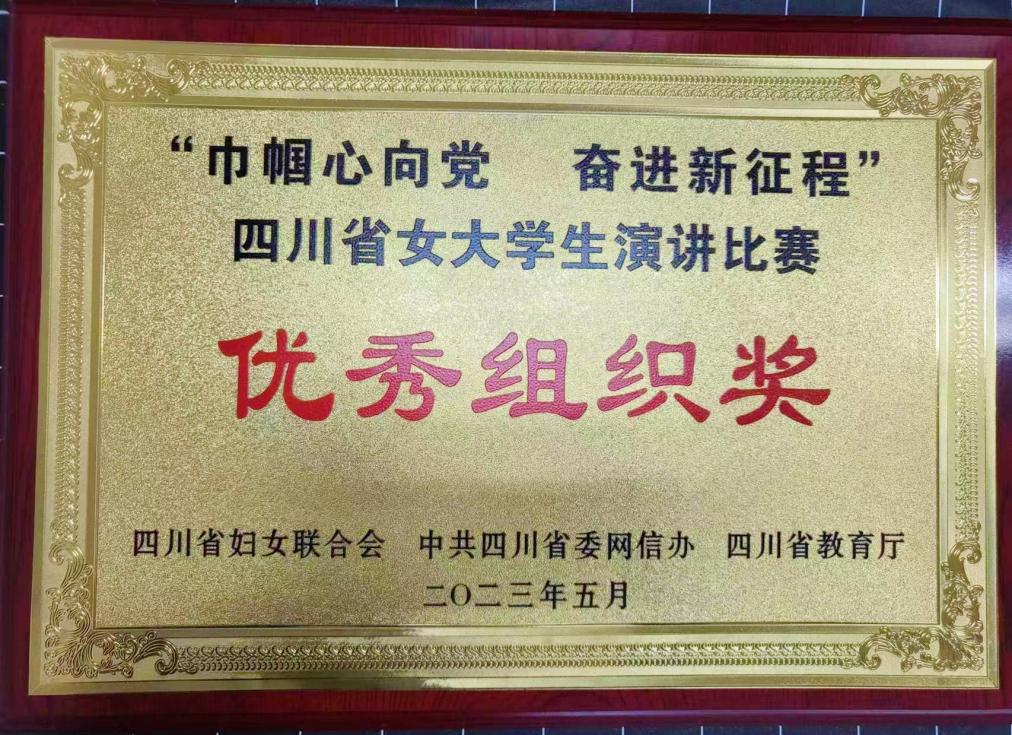 为进一步深入开展学习贯彻习近平新时代中国特色社会主义思想主题教育,展示新时代女大学生青春风采,激励带动更多的女大学生弘扬正能量、争做巾帼好网民,争做伟大事业的建设者、文明风尚的倡导者、敢于追梦的奋斗者,5月22日,由省妇联、省委网信办、教育厅共同举办的“强国复兴有我——巾帼心向党 奋进新征程”四川省女大学生演讲比赛决赛在成都举行,我校荣获优秀组织奖,我校经济管理学院安静泽同学的演讲《强国有我 青春担当》荣获三等奖。